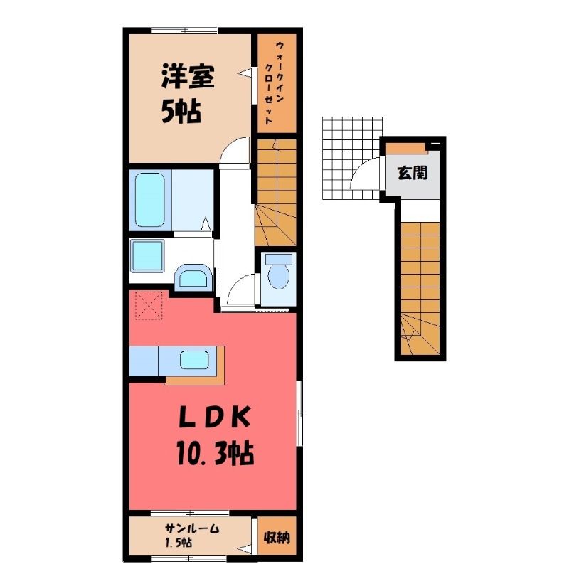 新築築の2階建てのアパートで、お部屋は2階建ての1階部分です。