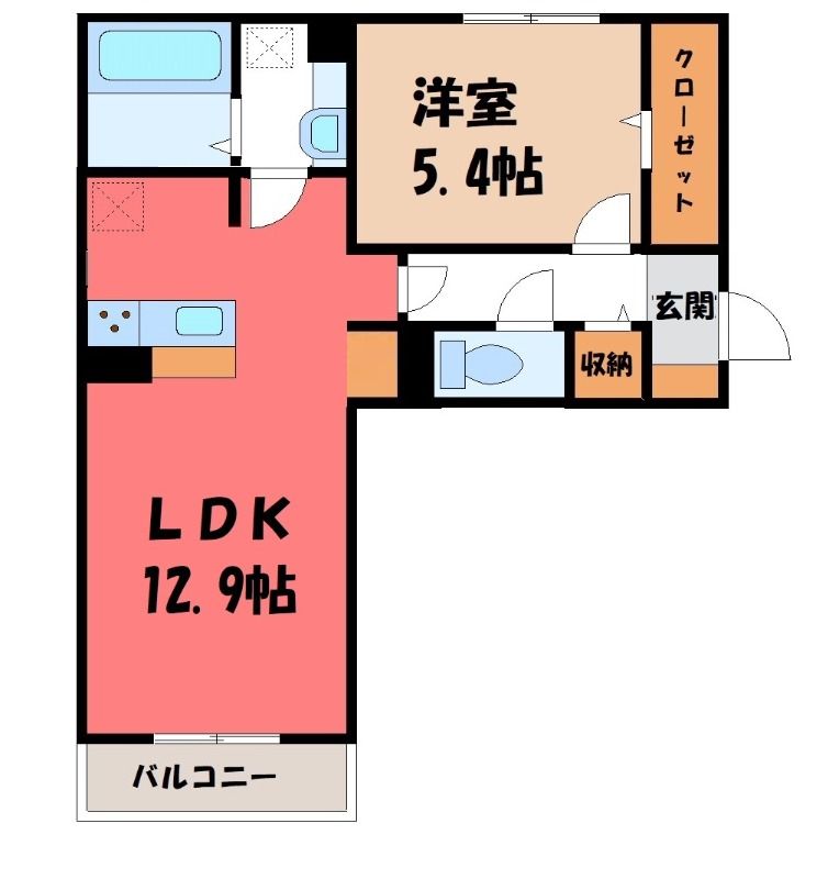 1LDK( LDK12.9畳/洋室5.4畳(*階) ) |