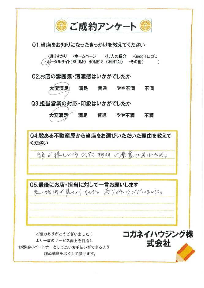 良い物件が見つかりました。ありがとうございました。