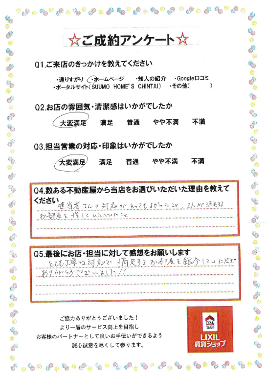 とても丁寧な対応で、満足するお部屋を紹介していただきありがとうございました‼(前橋市 O様)